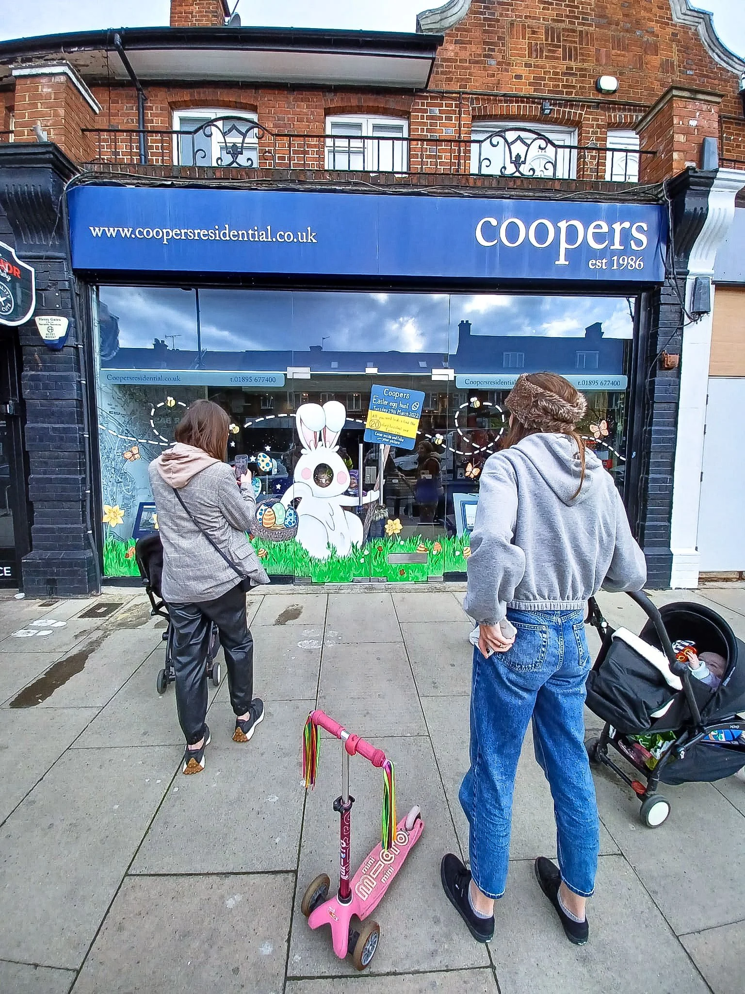 As the centrepiece of this project, we encouraged community engagement with both the business and the art itself. Children could participate in the artwork by entering the premises and making their faces that of the Easter Bunny’s. Many pictures were taken with children happily posing as our hand-painted creature who held the branded sales board for Coopers residential. This high street window installation and approach were effective as advertising as well as serving to contribute to social value of the local surroundings & community. You can cultivate a fun, welcoming brand image and contribute to your high street culture at the same time.