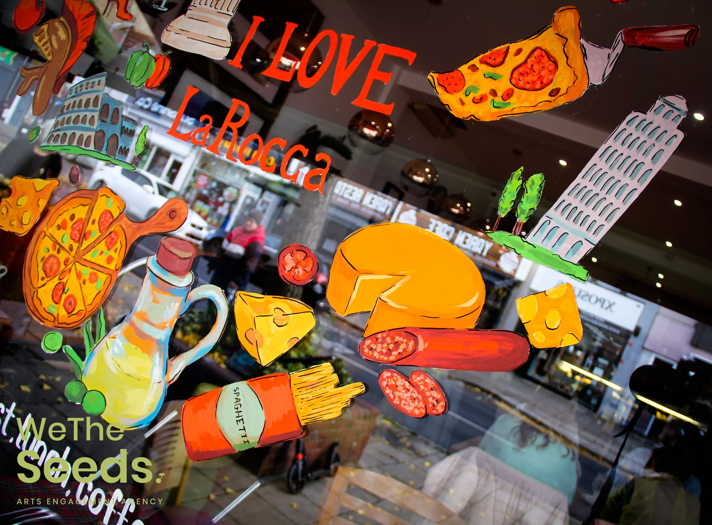 Working closely with each high street business, our window art advertising team hand-painted 15 unique pieces of Window Art Advertising within 10 days. These were all following designs approved by high street business owners and painted directly onto the shop’s shopfront glass window with specialist window paint.