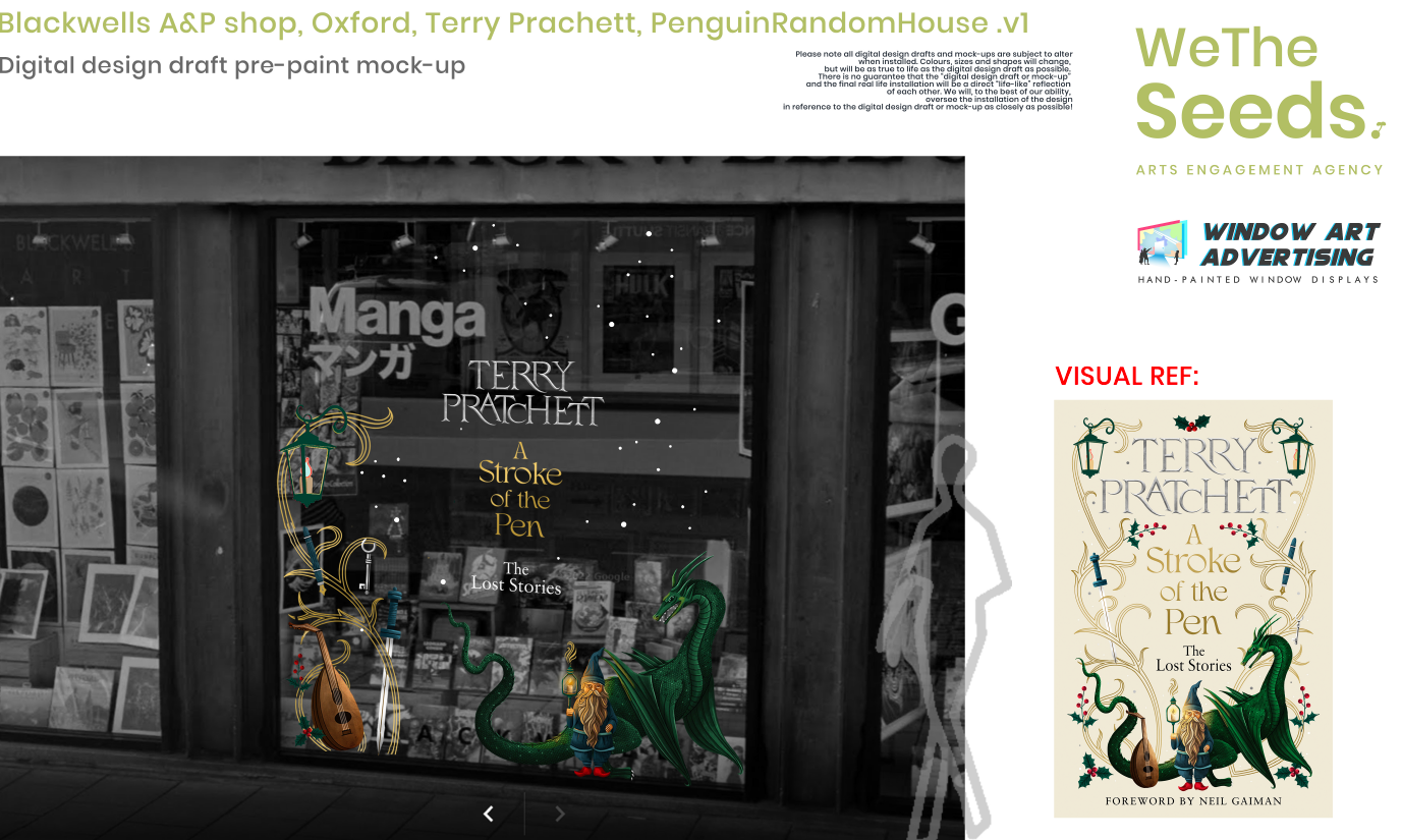 WeTheSeeds were asked by Penguin Random House UK (Transworld) to design and install 6 pieces of Window Art Advertising up and down the United Kingdom for Terry Pratchett’s latest book “A Stroke of the Pen”.