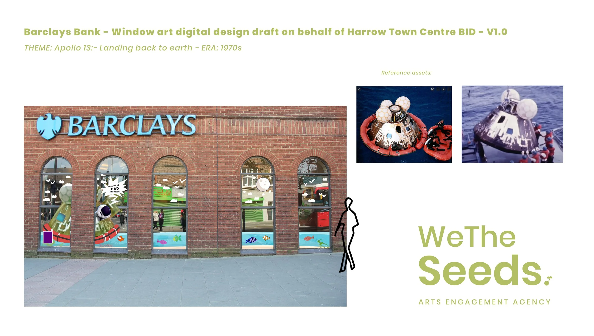 The window art campaign would involve 11 town centre businesses, with hand-painted pieces of window art all containing a unique puzzle to solve. Each of the window art designs which housed each puzzle captured a moment in time from within the Queen's reign… From Y2K, to the Apollo 13’s mission to the moon, to the London 2012 Olympics… and much much more!