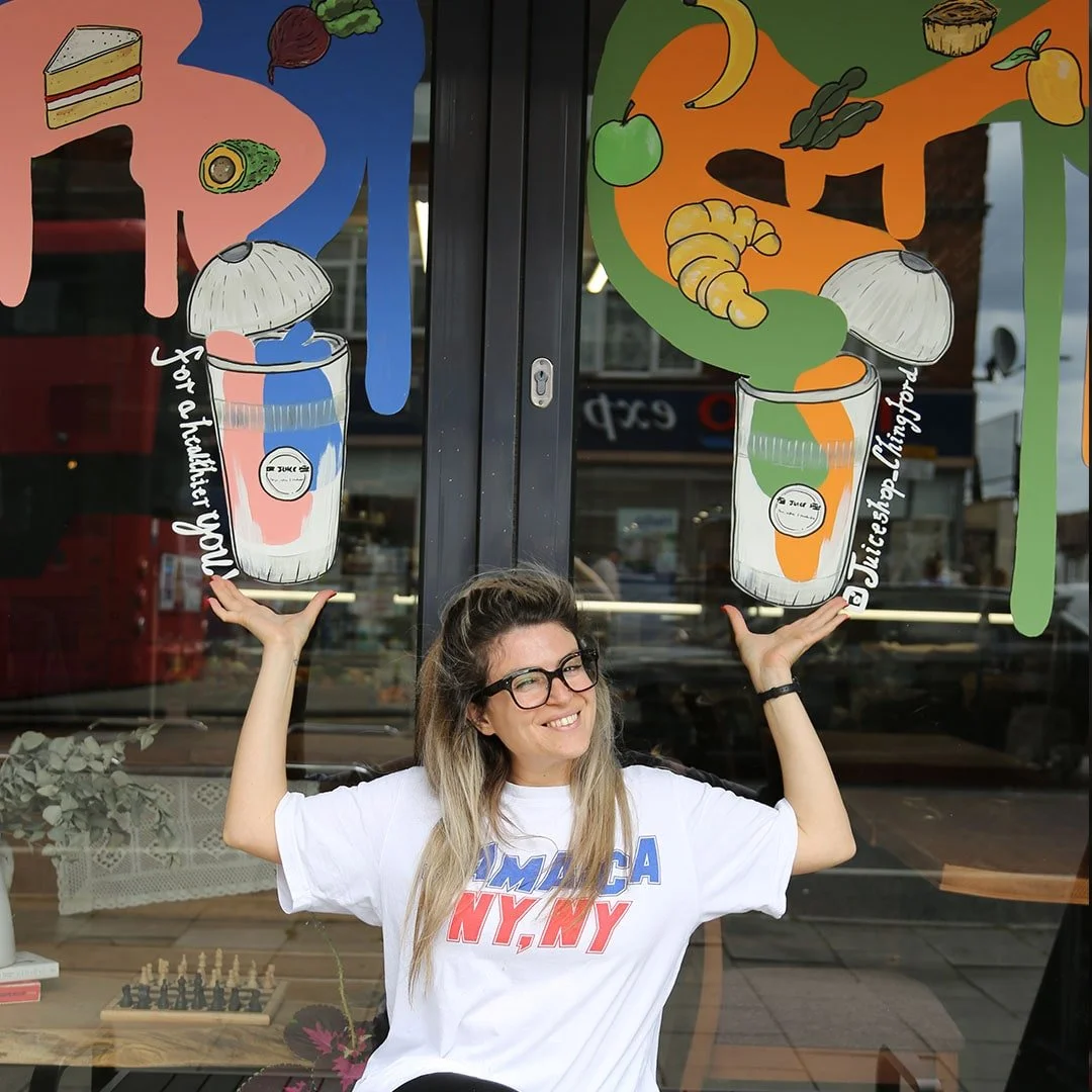 Our colourful, large scale window murals gets people speaking positively about your brand. Our window artists will create a lively engagement opportunity both in real life and over social media for your high street business & community. We’ll invite in passers-by’s, and talk highly of your offering, all whilst making your shop stand out from the rest of the high street.